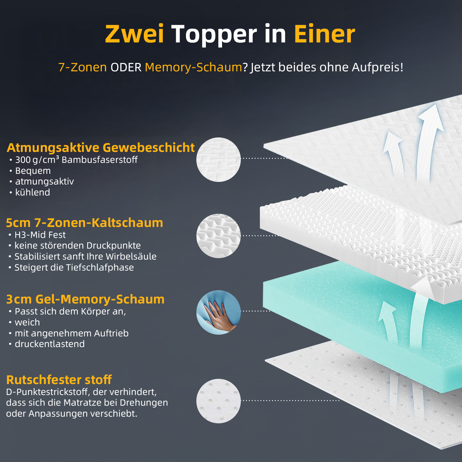 Welches Schlafkomfortlevel wünschst du dir? Möchtest du stabiler auf der Matratze "liegen" (nicht so tief einsinken), oder bevorzugst du ein "eingehülltes" Gefühl (mehr Elastizität)? Brauchst du eine kühlende Wirkung (z. B. bei nächtlichem Schwitzen) oder bevorzugst du eine warme, bequeme Oberfläche?